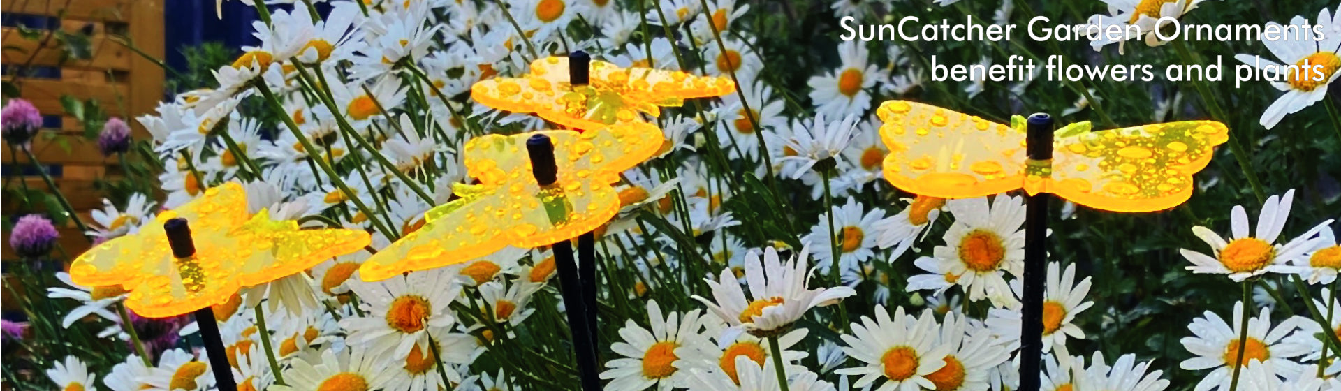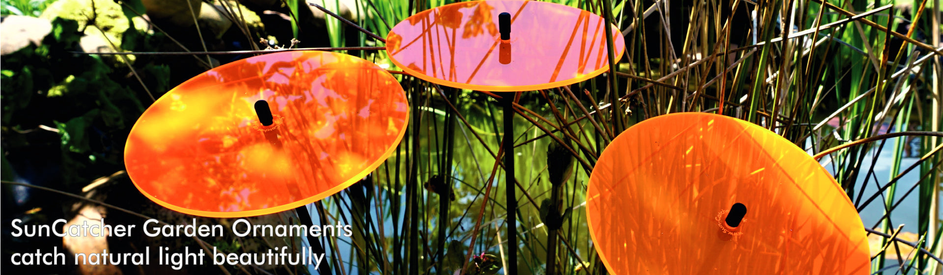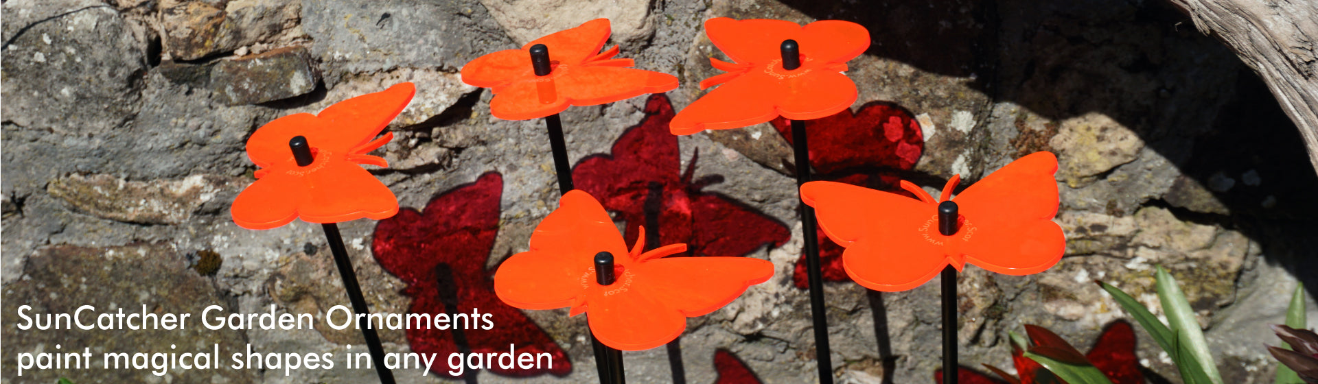 All SunCatcher garden décor ornaments are fluorescent. They collect invisible natural daylight on their surface, convert it into visible and glow for your around their edges and corners in the most vibrant colours red, orange, yellow, green and blue. Find your favourite SunCatcher in our SunCatcher garden décor range:
