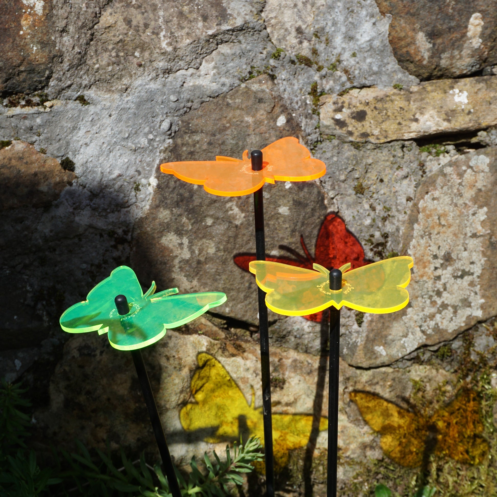 This Set of 3 SunCatchers 'Butterfly' consists of:- a three wide, glowing light collector in red, orange, yellow, green or blue- three 50cm long, black swing rod,- matching support rings and end caps. Planted it is about 45cm high and looks great in your flower bed or pot.