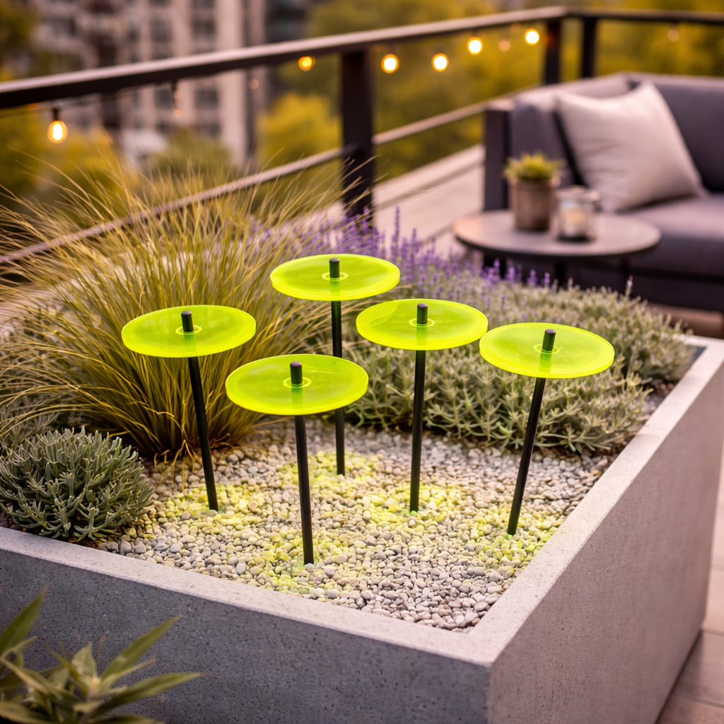 Sun Discs add long lasting, year round, vibrant colour to your home space, indoor and out. These garden stakes pick up UV light from early dawn to dusk, glowing at their edges, bringing welcome light on dark winter days. A great gift for gardeners or to add a splash of colour as plant markers or in pots and planters.