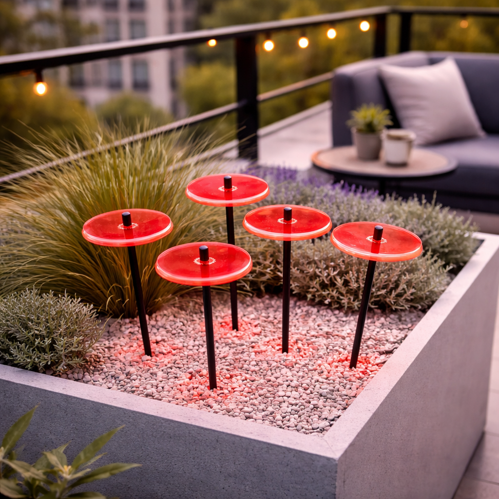 This Set of 5 SunCatchers 'Sun Disc' consists of: - 5x 6cm wide, glowing light collector in red, orange, green or blue - 5x 25cm long, black swing rod, - 5x matching support rings and end caps. Planted it is about 20cm high and looks great in your flower bed or pot.